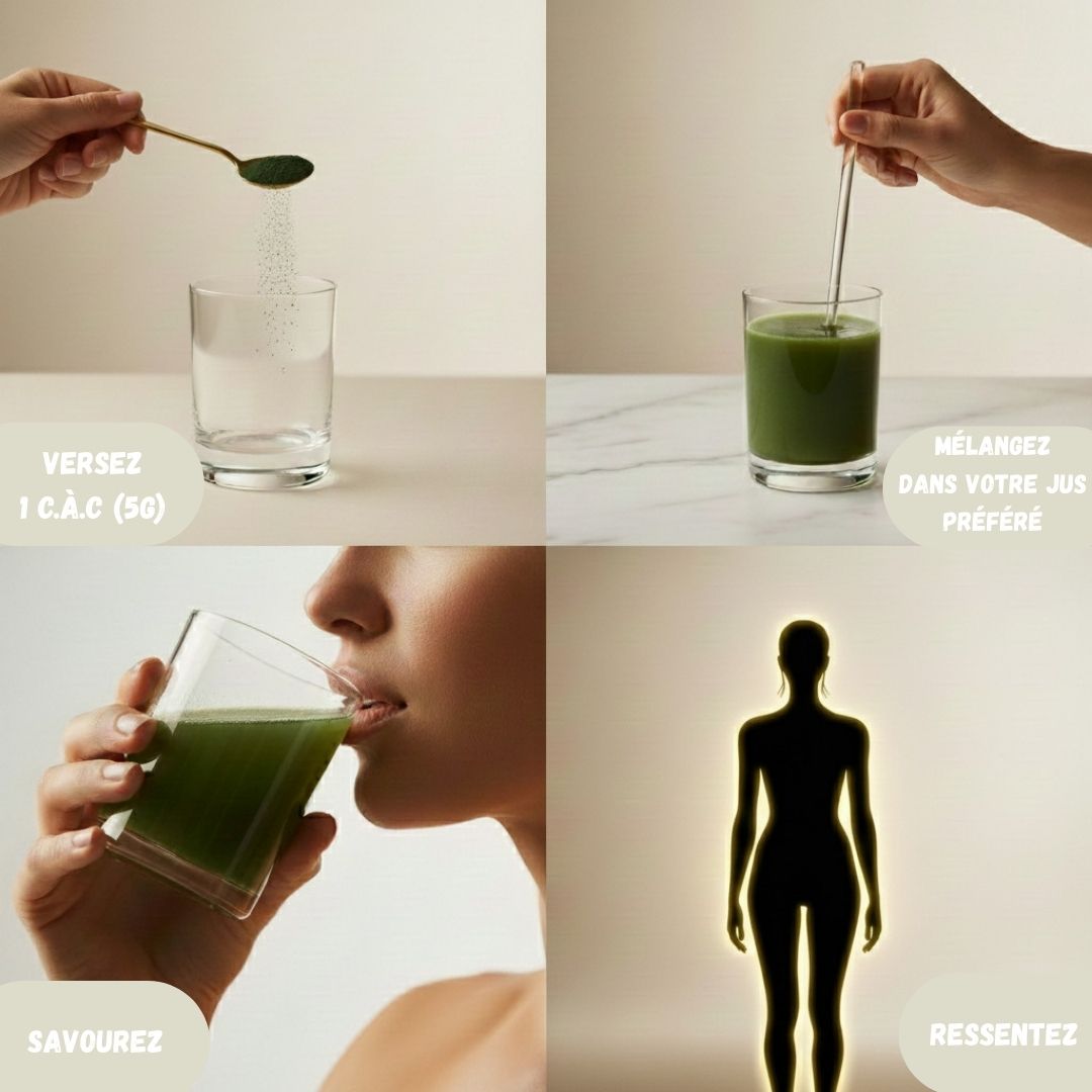 Je me sens aussi plus régulière dans la journée, sans gros coups de fatigue. Pour moi, c’est clairement une version améliorée de la spiruline, avec de vrais bénéfices en plus !”